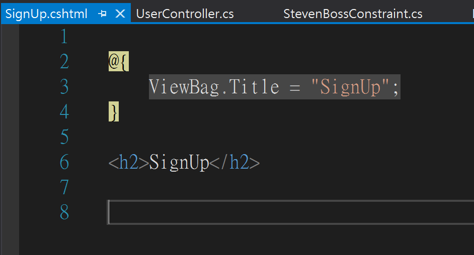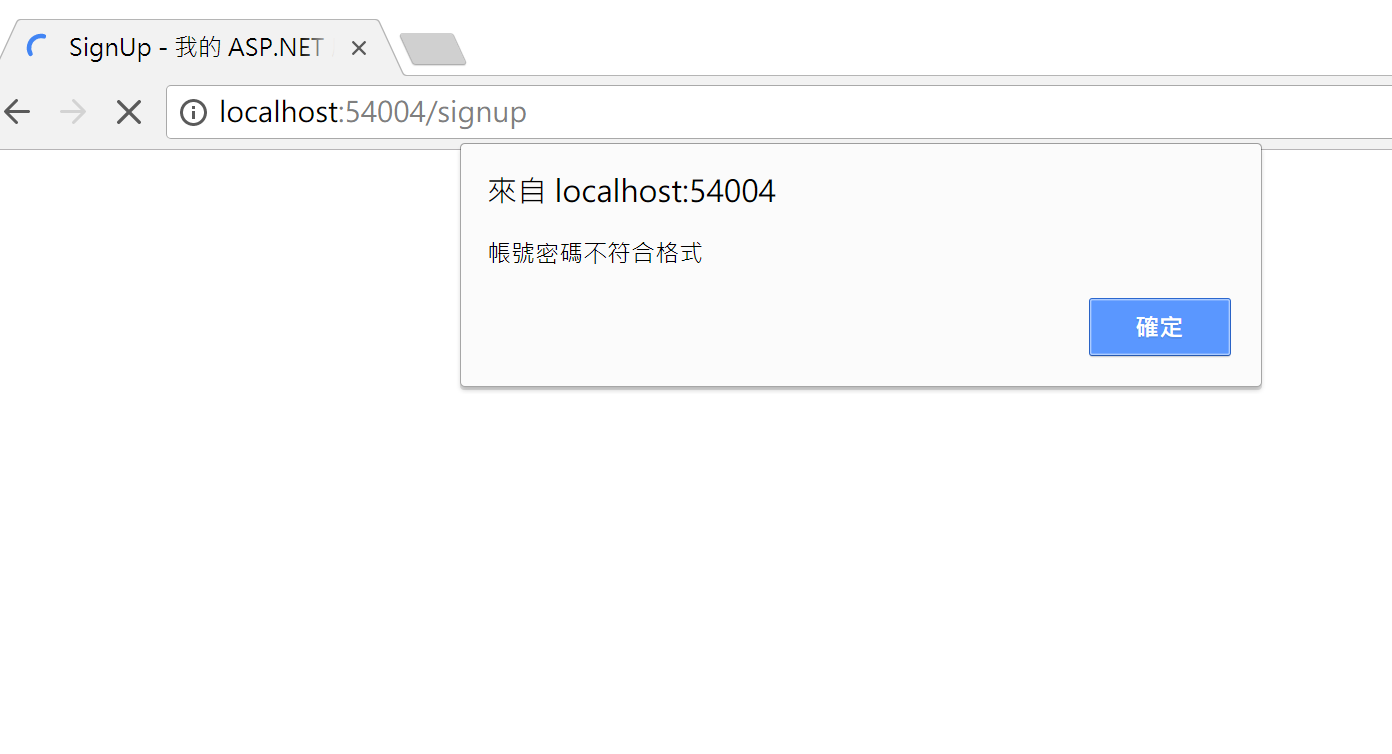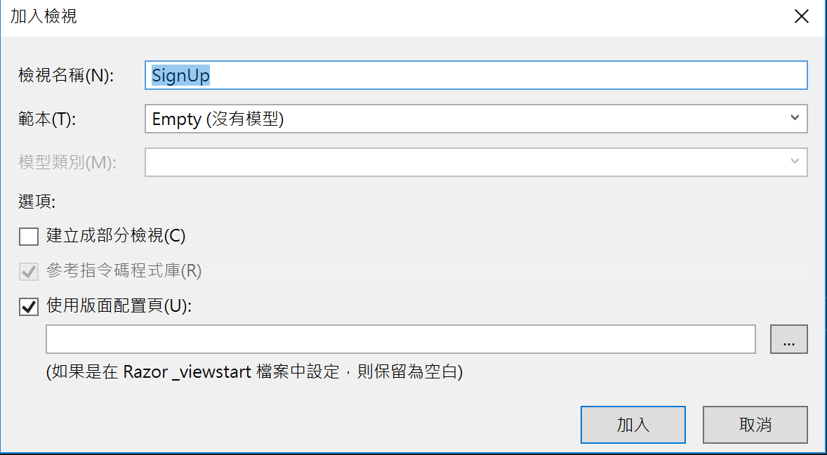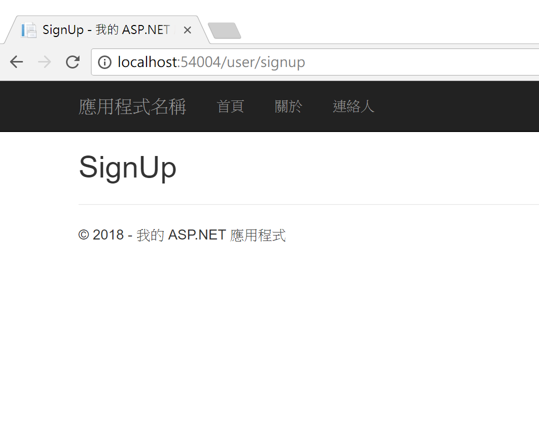 接著寫一個SignUp的Action,這邊有看到我們掛HttpGet的Attribute,只是指定呼叫動詞必須是Get的方式才會執行到這個Action