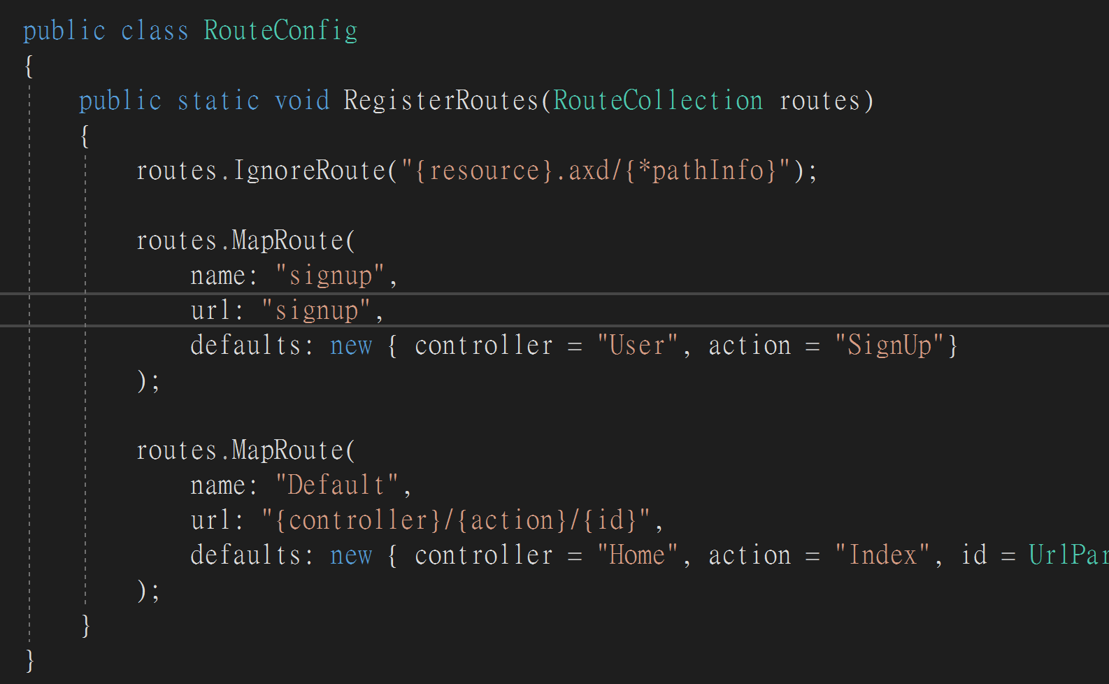 而這邊網址是 /user/signup,我覺得不夠直覺,所以到RouteConfig改一下