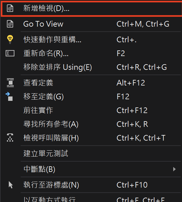 而這個Action沒有任何內容,只有回傳一個View而已,接著我們來實作出回傳的頁面,在這個Action中點擊右鍵 > 新增檢視