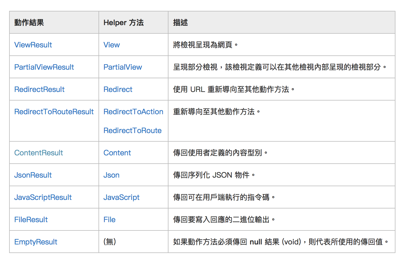 在Controller裡面寫的方法我們稱之為Action,而他通常都會回傳ActionResult