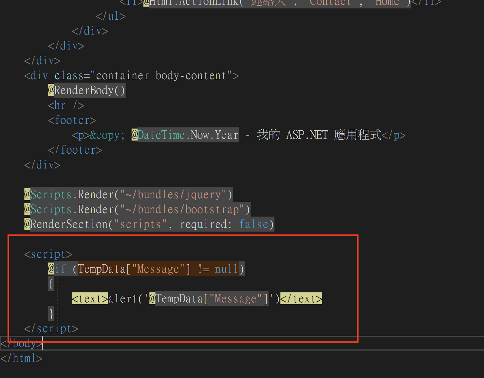 然後呢? 有沒有發現即便這邊都比對正確,符合route規則,但我們沒告訴他Controller是誰,Action是誰,程式當然不知道該去執行誰,所以再來改一下,因為我們還沒學到如何建立Controller跟Action,所以先用現成的, 導到homeController的Contact吧